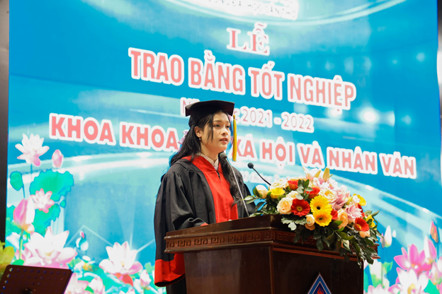 Tân khoa Nguyễn Phì Nhiêu - Thủ khoa Ngành Văn học dại diện cho các tân khoa phát biểu cảm nghĩ
