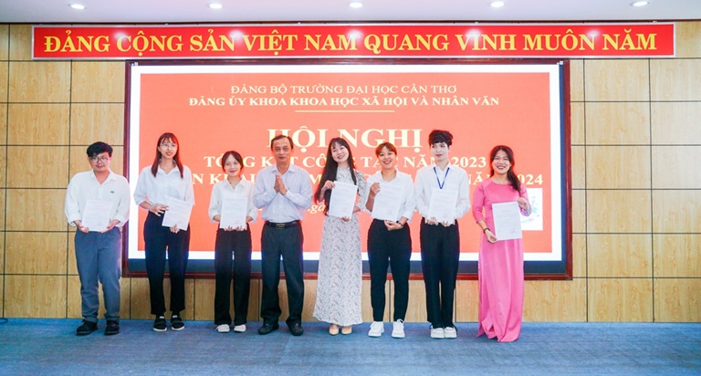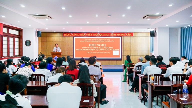 Tại hội nghị, TS. Bùi Thanh Thảo - Bí thư Đảng uỷ Khoa KHXH&NV đã báo cáo tổng kết công tác của Đảng bộ khoa trong năm 2023 và triển khai nhiệm vụ công tác cho năm 2024. Đảng bộ Khoa có tổng số 91 đảng viên bao gồm giảng viên, học viên và sinh viên; đã tăng 16 đảng viên so với cuối năm 2022; kết nạp được 25 đảng viên, giới thiệu 48 quần chúng học lớp nhận thức về Đảng, cử 14 đ/c học lớp lý luận chính trị dành cho Đảng viên mới. Có 2 đ/c hoàn thành lớp Trung cấp Chính trị, 1 đ/c được cử đi học lớp Cao cấp lý luận chính trị, 1 đ/c được cử tham dự lớp Bồi dưỡng cấp ủy. Trong năm qua, toàn Đảng bộ khoa đã phấn đạt và vượt nhiều chỉ tiêu đề ra trong năm 2023.