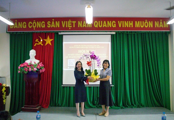 Cũng tại Hội nghị lần này, nhằm tri ân những đóng góp trong công tác giảng dạy và đào tạo của cán bộ đến tuổi nghỉ hưu, TS. Bùi Thanh Thảo thay mặt Khoa KHXH&NV trao quà tri ân cho Đ/c Nguyễn Huỳnh Mai. Đảng ủy Khoa gửi lời cảm ơn sâu sắc đến Cô vì những kiến thức quý báu đã truyền đạt, nhiệt huyết và tinh thần cống hiến hết mình cho Trường, Khoa trong thời gian qua.