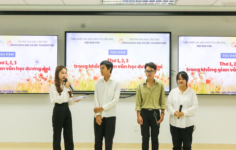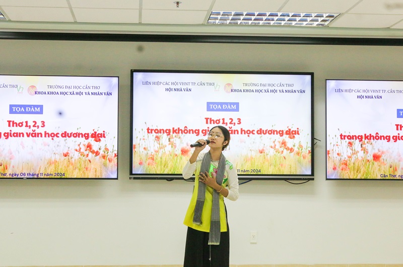 Cũng trong buổi tọa đàm về thơ 1,2,3, bên cạnh các tiết mục ngâm thơ do các nghệ sĩ biểu diễn, sinh viên các ngành Văn học và ngành Báo chí cũng chuẩn bị những tiết mục văn nghệ hấp dẫn, mang đậm bản sắc văn hoá vùng miền. Trong đó, tiết mục kịch thơ Cần Thơ - Thành phố tình yêu do sinh viên lớp Văn học và lớp Báo chí khoá 50 trình bày và ca cổ Nước chảy tình quê do Mai Dương Minh Anh (sinh viên ngành Văn học khoá 49 sáng tác và thể hiện) đã góp phần quảng bá, lan toả vẻ đẹp của đất và người Cần Thơ. Đây cũng chính là món quà tinh thần quý giá mà Ban Tổ chức dành tặng cho quý đại biểu đến từ những tỉnh thành, vùng miền khác.
