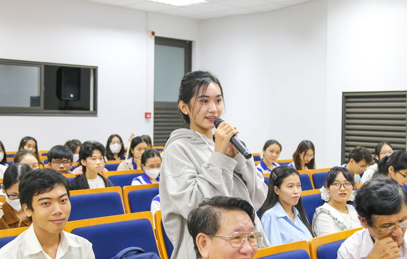 Sinh viên Nguyễn Thị Như Ý (lớp Báo chí khoá 50) đặt câu hỏi trao đổi cùng nhà thơ Phan Hoàng