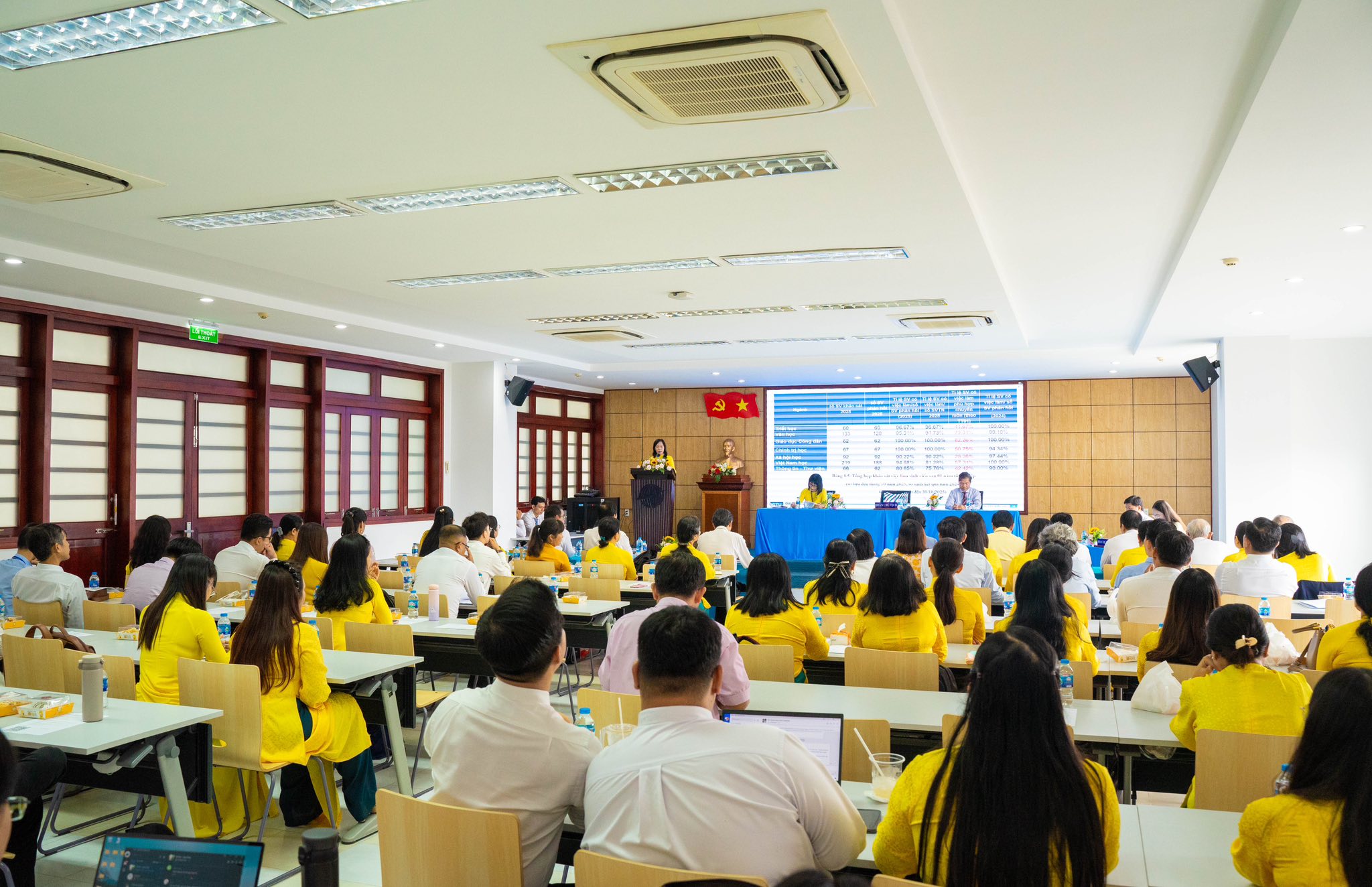 Tại hội nghị, tập thể viên chức và người lao động đã cùng nhìn lại những kết quả nổi bật trong năm học 2024–2025 – một năm được xem là bước chuyển nhịp của toàn hệ thống giảng dạy, nghiên cứu và phục vụ cộng đồng. Báo cáo tổng kết cho thấy Khoa tiếp tục phát triển cả về quy mô, chất lượng đào tạo, nghiên cứu khoa học, hợp tác quốc tế và công tác đoàn thể. Các chỉ số về đội ngũ, chương trình đào tạo và tỉ lệ sinh viên có việc làm sau tốt nghiệp đều duy trì ở mức cao; hoạt động nghiên cứu khoa học mở rộng, nhiều công trình được công bố trong và ngoài nước. Tại hội nghị, nhiều viên chức đã đóng góp ý kiến hữu ích và được GS.TS Trần Ngọc Hải – Phó Hiệu trưởng Trường Đại học Cần Thơ trực tiếp ghi nhận.