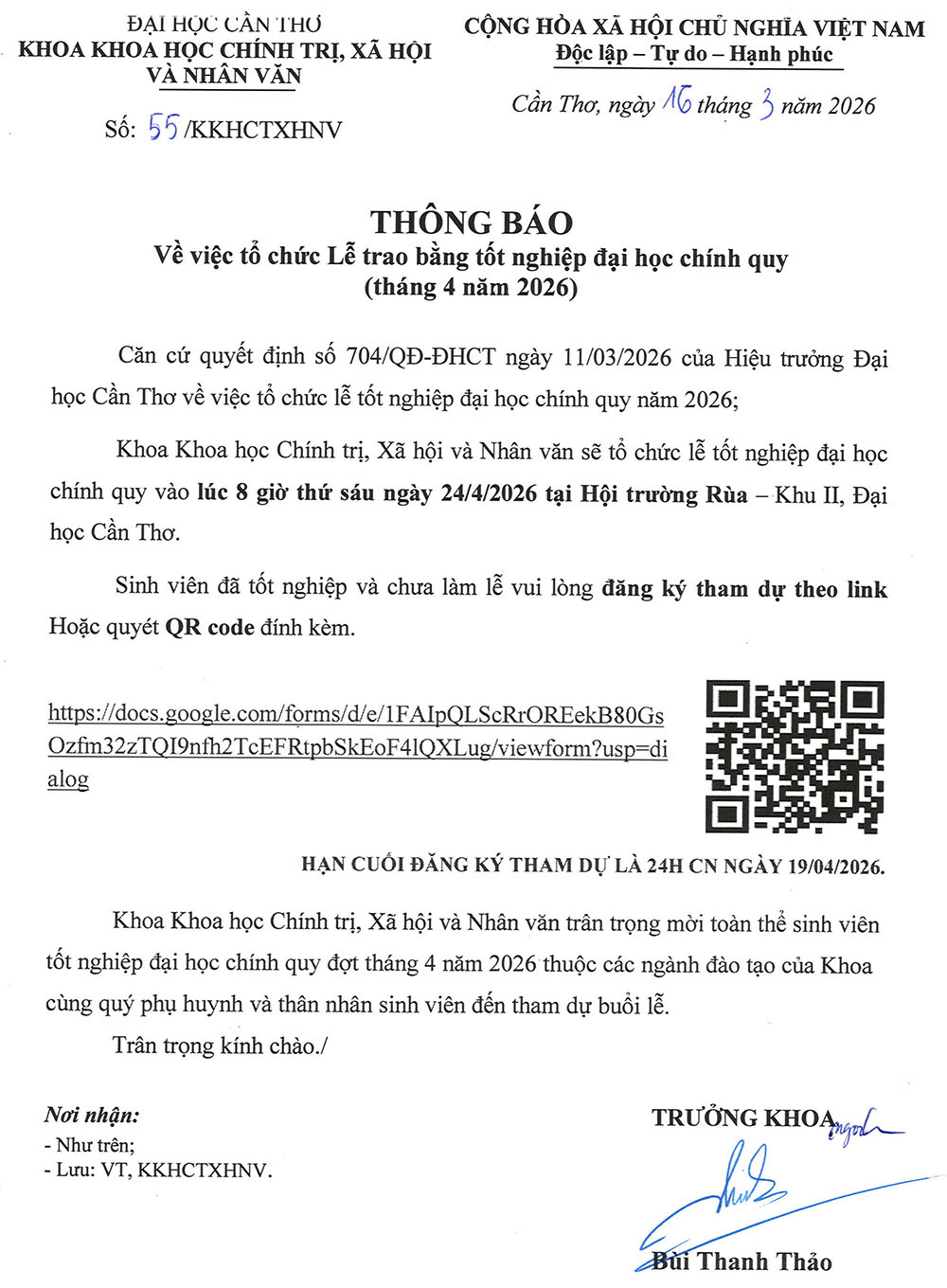 Căn cứ quyết định số 704/QĐ-ĐHCT ngày 11/3/2026 của Hiệu trưởng Đại học Cần Thơ về việc tổ chức Lễ tốt nghiệp đại học chính quy năm 2026; Khoa Khoa học Chính trị, Xã hội và Nhân văn sẽ tổ chức Lễ tốt nghiệp vào lúc 8 giờ ngày 24/4/2026 (Thứ sau) tại Hội trường Rùa - Khu II, Đại học Cần Thơ.