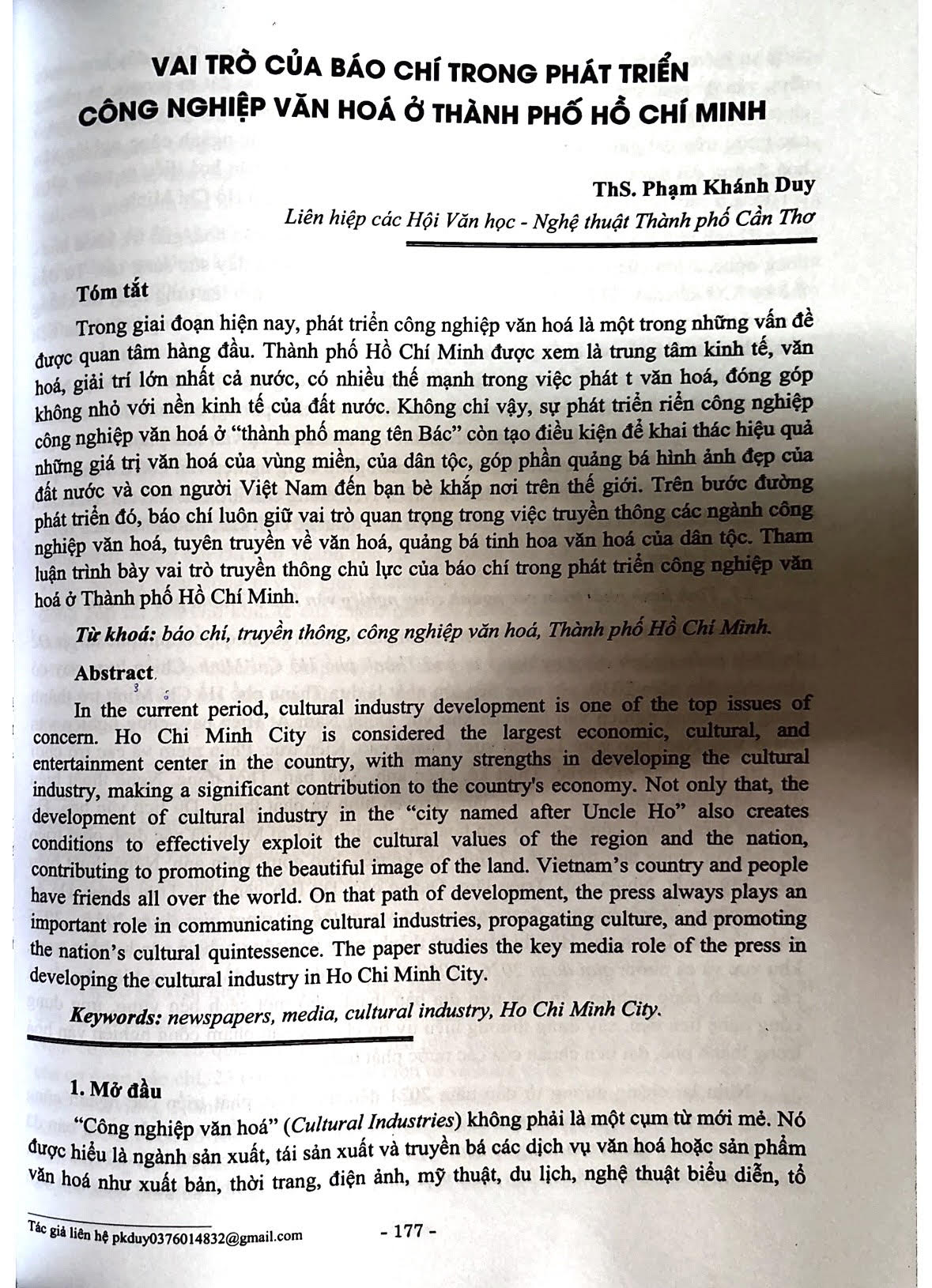 VAI TRÒ CỦA BÁO CHÍ TRONG PHÁT TRIỂN CÔNG NGHIỆP VĂN HÓA THÀNH PHỐ HỒ CHÍ MINH - ThS. Phạm Khánh Duy (Giảng viên Bộ môn Ngữ văn, Khoa KHXH&NV, Trường ĐH Cần Thơ)