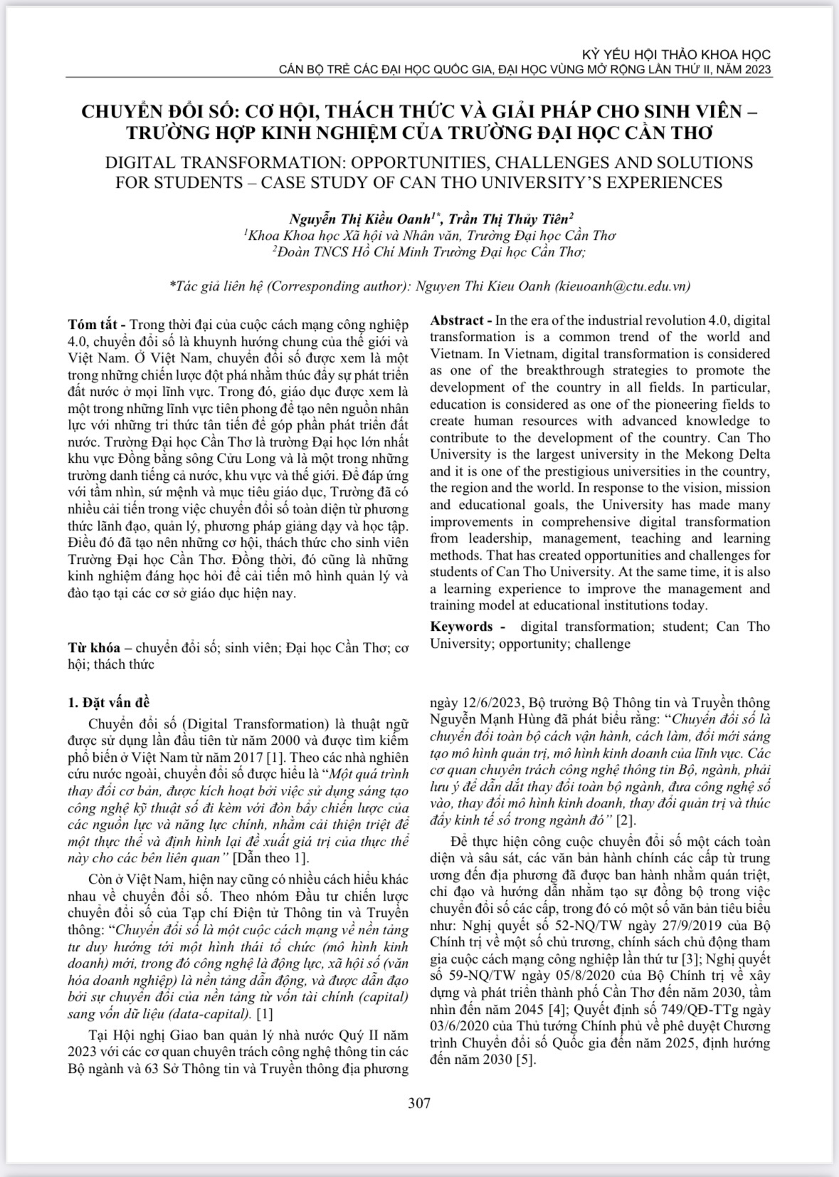 CHUYỂN ĐỔI SỐ: CƠ HỘI, THÁCH THỨC VÀ GIẢI PHÁP CHO SINH VIÊN - TRƯỜNG HỢP KINH NGHIỆM CỦA TRƯỜNG ĐẠI HỌC CẦN THƠ - TS. Nguyễn Thị Kiều Oanh (Giảng viên Bộ môn Ngữ văn, Khoa KHXH & NV, Trường Đại học Cần Thơ) - Trần Thị Thủy Tiên (Đoàn TNCS Hồ Chí Minh)