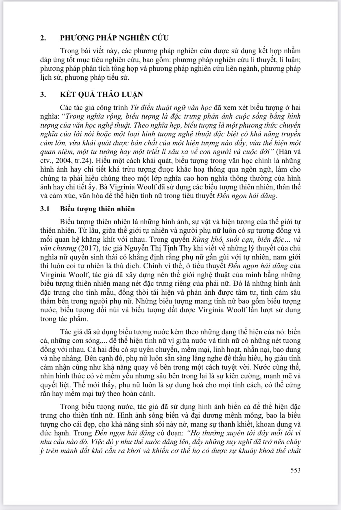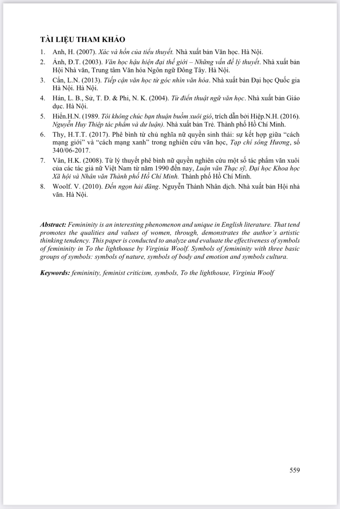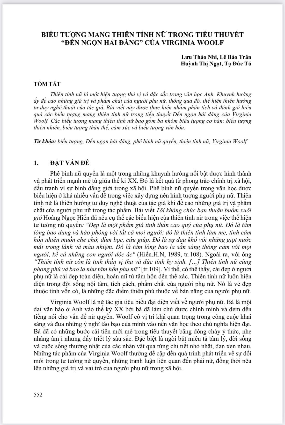 BIỂU TƯỢNG MANG THIÊN TÍNH NỮ TRONG TIỂU THUYẾT ĐẾN NGỌN HẢI ĐĂNG CỦA VIRGANIA WOOLF (TS. Tạ Đức Tú, Giảng viên chính - Bộ môn Ngữ văn, Khoa KHXH&NV, Trường Đại học Cần Thơ) và cs