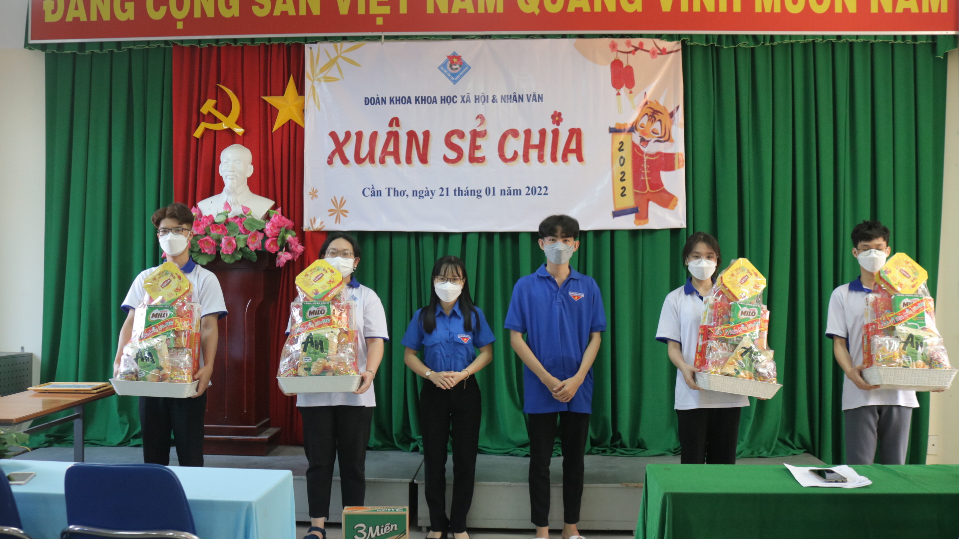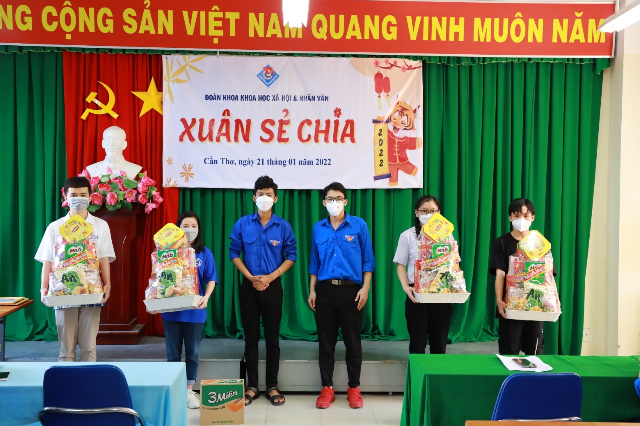 Tiếp nối thành công của hành trình san sẻ yêu thương đó, vào chiều ngày 21/01/2022, Đoàn khoa KHXH&NV đã tổ chức chương trình “Xuân sẻ chia 2022” nhằm trao 4 phần học bổng và 8 phần quà cho các bạn sinh viên nhưng vẫn đảm bảo tuân thủ nghiêm chỉnh các biện pháp phòng dịch.