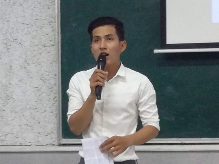 SV Trần Hoàng Tính, đại diện SV Khóa 43 phát biểu chào mừng tân SV K44. Ảnh: Hồng Ngọc