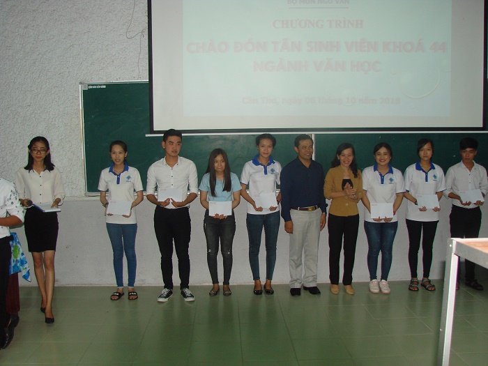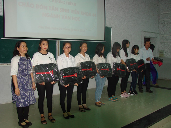 Sau những lời phát biểu khai mạc và chào mừng, chương trình tiến hành trao các suất học bổng và các phần quà hỗ trợ do các cá nhân, tập thể và đơn vị tài trợ. Trong đó, các em sinh viên đã nhận được 10 suất học bổng, mỗi suất trị giá 1,5 triệu đồng do Thầy Lê Văn Phương, giảng viên Bộ môn Ngữ văn cùng với bạn bè và cựu sinh viên hỗ trợ các em SV vượt khó học giỏi; Trung tâm Kinh doanh VNPT - Cần Thơ đã gửi tặng 11 phần quà đến 11 tân SV K44; anh Phan Thế Nguyễn, cựu SV K40 cũng đã trao 02 phần quà đến 2 tân SV.