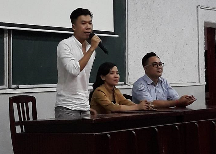 Anh Lê Đình Tuyển (bìa phải), anh Nguyễn Khôi Nguyên cùng Cô Bùi Thanh Thảo trả lời những câu hỏi về định hướng nghề nghiệp của SV