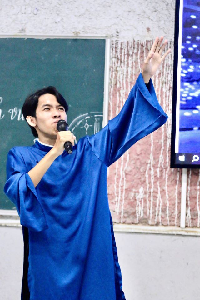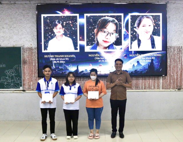 Anh Phan Thế Nguyễn - cựu sinh viên và cựu học viên Bộ môn Ngữ văn trao học bổng cho tân sinh viên là thủ khoa ngành