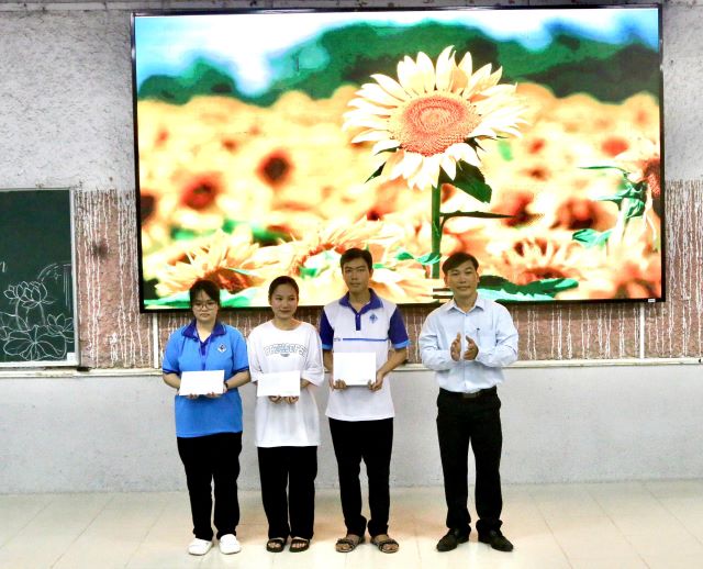 Thầy Lý Thành Luỹ - đại diện Quỹ Sáng kiến xanh & Điện toán bền vững trao học bổng cho tân sinh viên có nhiều nỗ lực vượt khó trong học tập