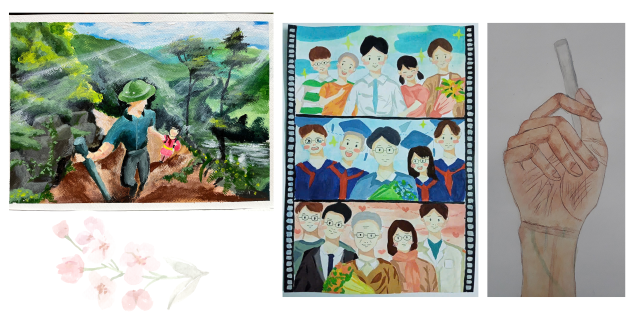 Những tác phẩm tranh vẽ là minh chứng rõ nét cho tài năng nghệ thuật và sự sáng tạo của sinh viên. Từng nét cọ, từng mảng màu được phối hợp tinh tế để tái hiện hình ảnh thầy cô trong những khoảnh khắc giản dị mà ý nghĩa. Các bức tranh không chỉ thu hút bởi sự khéo léo trong hình thức mà còn chứa đựng những thông điệp sâu sắc.